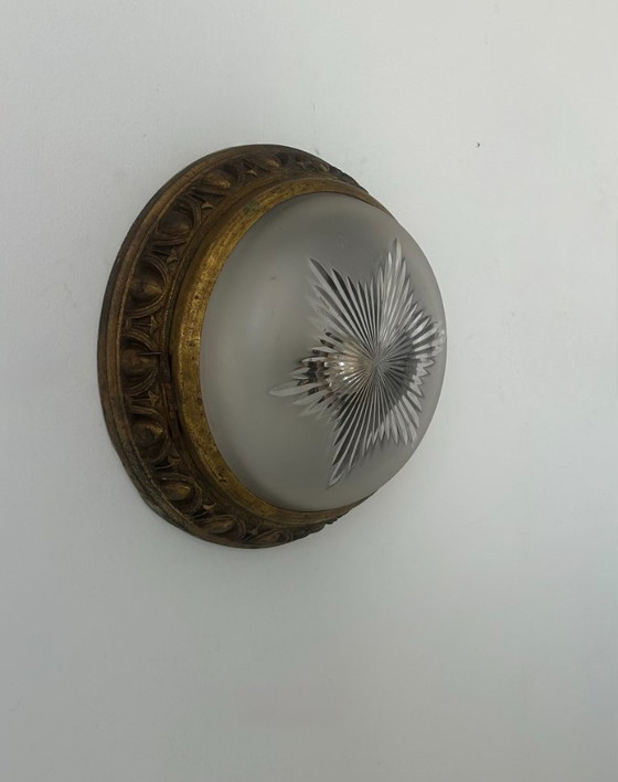 Splendida lavorazione dell'ottone, vetro sabbiato curvo che diffonde una luce calda.