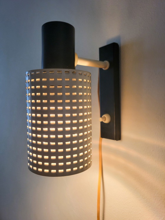Lampada da parete vintage Fiesta disegnata da H. Busquet per Hala Zeist, 1960. La lampada ha un paralume in metallo bianco traforato che diffonde delicatamente la luce. La lampada può essere montata con il paralume rivolto verso l'alto o verso il basso. La lampada è in ottime condizioni vintage e originali. Dimensioni: altezza 17 cm, larghezza 14 cm, profondità 8 cm.