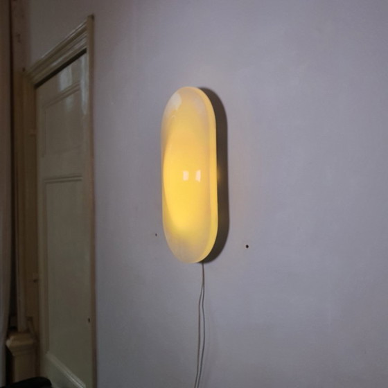 Lampada da parete o da soffitto Guzzini modello 5346, progettata dal team di design iGuzzini nel 1979. Una bella lampada senza tempo prodotta negli anni '90, progettata con una forma a goccia. La lampada è costituita da una piastra metallica bianca su cui è fissato un paralume in metacrilato bianco con quattro maniglie (che possono ruotare di 180 gradi per aprirla e chiuderla).