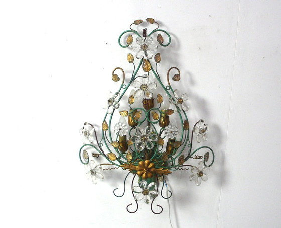 Lampada da parete in metallo verde con cristalli, 5 luci, anni '60, stile Kögl, Veralux Italia