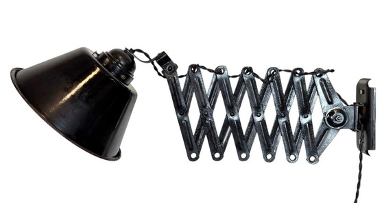 Questa lampada da parete vintage industriale regolabile a forbice è stata prodotta in Germania negli anni '30. La lampada ha un paralume in metallo smaltato nero con interno smaltato bianco. Il braccio a forbice in ferro nero è estensibile e può essere ruotato lateralmente. Il portalampada originale richiede lampadine standard E27/E26. Nuovo filo tessile. La lampada può essere utilizzata con spina o cablata.
