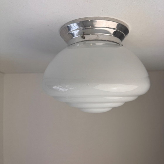 Lampada da parete o soffitto in vetro opalino Art Déco vintage con base in alluminio. In buone condizioni generali. Ricablata. Collegamento tramite morsettiera. Attacco a baionetta (lampadina B22)