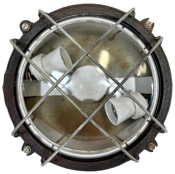 Lampada da parete o soffitto industriale prodotta da Elektrosvit nell'ex Cecoslovacchia negli anni '60. Presenta un corpo in ghisa, una copertura in vetro trasparente e una griglia in acciaio. Due portalampada in porcellana richiedono lampadine E 27/E 26. Cavo nuovo. Il peso della lampada è di 6,4 kg.