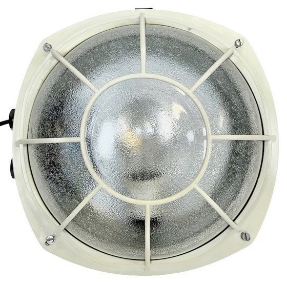 Lampada da parete vintage industriale in bachelite, prodotta da Elektrosvit nell'ex Cecoslovacchia negli anni '80. Presenta un corpo in bachelite, una copertura in vetro curvo satinato e una griglia in bachelite. L'attacco richiede lampadine standard E27/E26. Può essere utilizzata anche come lampada da soffitto. Il peso della lampada è di 2 kg.