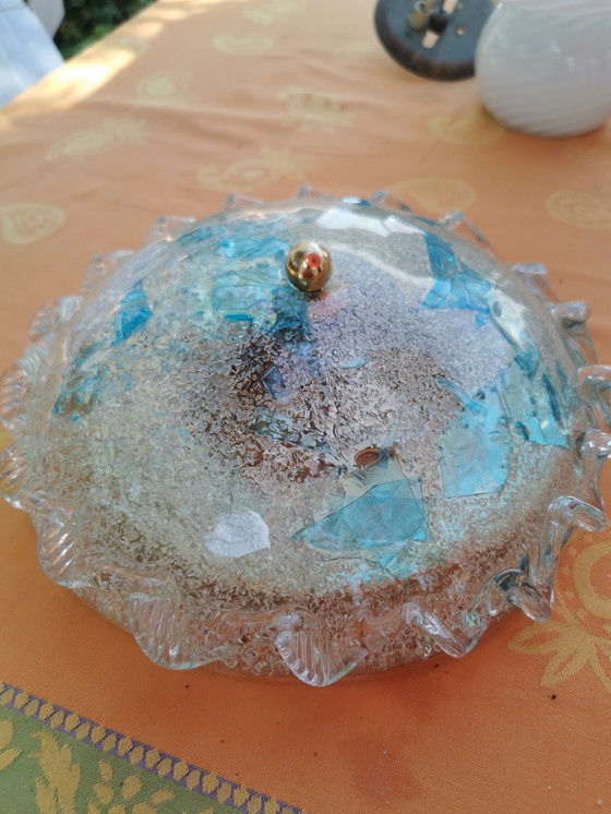 Sublime e rara applique o plafoniera di metà secolo in vetro di Murano Graniglia, stile Barovier, con bordo orlato. Le foglie di vetro turchese sono integrate in un motivo a mosaico.