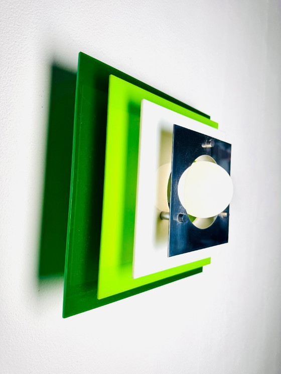 Questa iconica lampada multistrato degli anni '70, nei toni del verde, del metallizzato e del bianco, può essere utilizzata sia come plafoniera che come lampada da parete, rendendola un'aggiunta versatile a qualsiasi casa. La lampada è realizzata in strati metallici, creando un effetto sorprendente e strutturato che si adatta agli interni moderni.