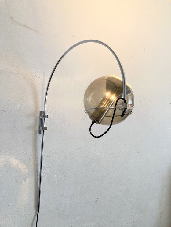 Lampada da parete degli anni '60 e '70, regolabile in altezza e con paralume girevole, progettata negli anni '60 da Frank Ligtelijn per Raak, Amsterdam. Vetro fumé, metallo cromato e alluminio. Buone condizioni d'uso. Lievi segni di usura, piccole scheggiature sui bordi del vetro. 82 x 25 x 60 cm.