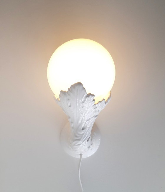 Lampada da parete scultorea in porcellana, foglie in ceramica con lampadina in vetro
