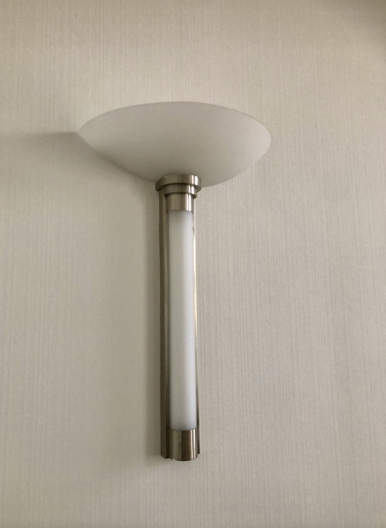 Lampada da parete in nichel e vetro sabbiato, progettata da Ricardo Bofill per la banca SWIFT di Bruxelles alla fine degli anni '80. È dotata di due sorgenti luminose funzionanti, che possono essere accese e spente separatamente. In buone condizioni, con un piccolo graffio sulla base in metallo e una piccola scheggiatura nella colonna in vetro.