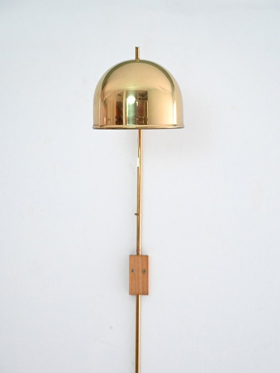 Lampada da parete vintage scandinava, modello V-75, disegnata da Eje Ahlgren per Bergboms negli anni '60. Realizzata in ottone con paralume a cupola regolabile e supporto a parete in legno massello. Un raffinato pezzo di design nordico di metà secolo, con proporzioni eleganti e materiali pregiati.