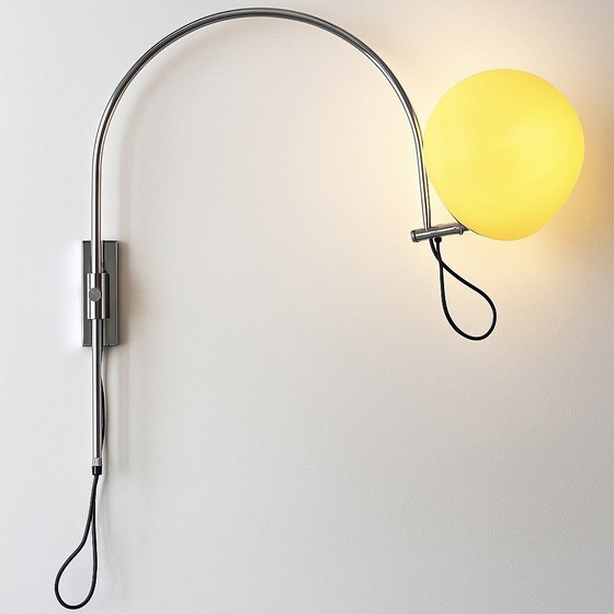 Questa applique risale probabilmente alla fine degli anni Settanta o all'inizio degli anni Ottanta. Si caratterizza per il braccio elegantemente curvo in metallo cromato e per il paralume sferico in plastica, che fornisce una luce calda e diffusa.