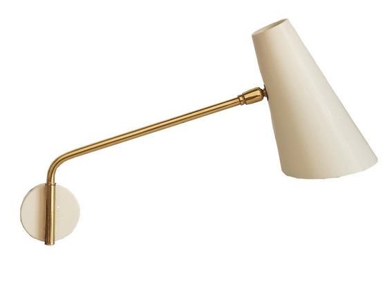 Paralume singolo in metallo beige, montato su uno snodo sferico e un braccio in ottone, il tutto poggiato su una piccola base rotonda in metallo beige.
