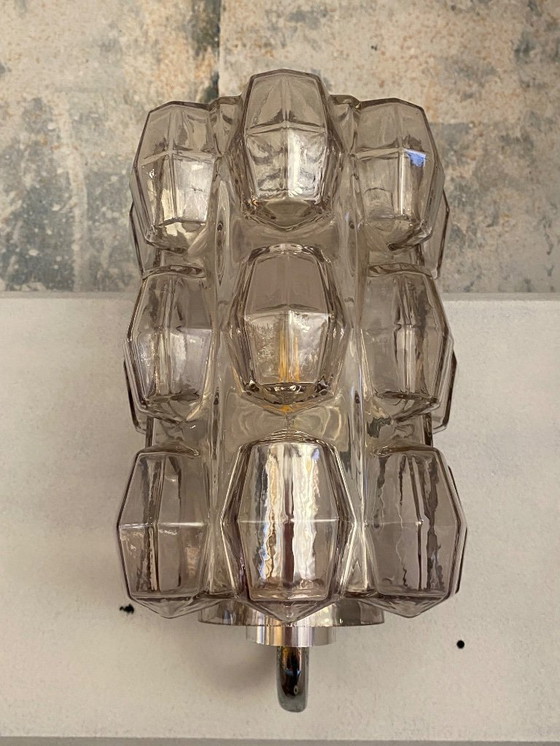 Lampada da parete vintage in vetro fumé e metallo cromato di Glashütte Limburg, attribuita a Helena Tynell, primi anni '70. La lampada è in ottime condizioni e funzionante.