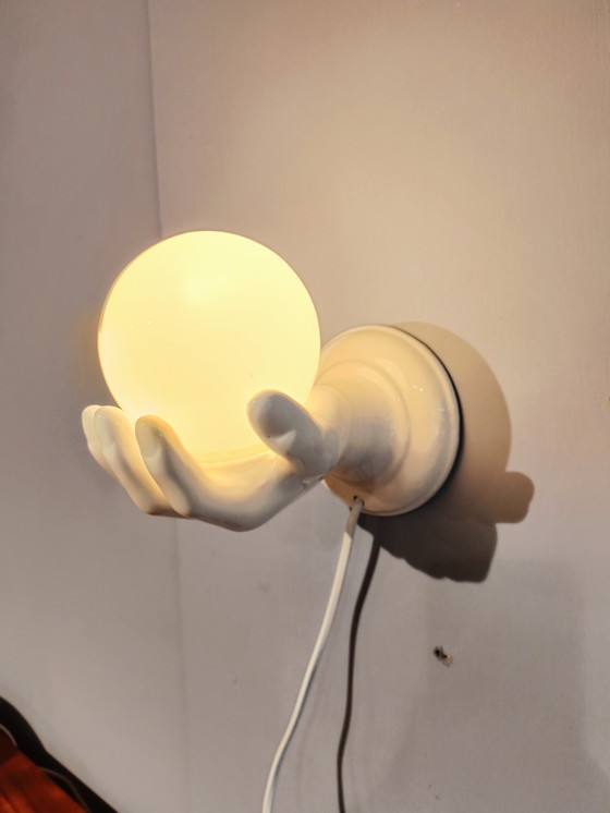 Questa lampada da parete scultorea in porcellana vintage è un pezzo unico. Con il suo elegante design a forma di mano che regge un globo, questa lampada emana un fascino raffinato, al tempo stesso classico e moderno. La lampada proietta una luce morbida e calda che crea un'atmosfera accogliente in ogni stanza.