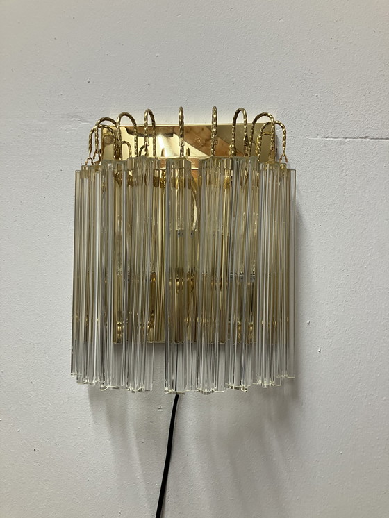 Splendida lampada da parete "Trilobo" di Venini Mirano. Questa lampada da parete presenta nove aste di cristallo appese al pannello a parete color oro. I cristalli e le tre fonti luminose creano un meraviglioso effetto luminoso!