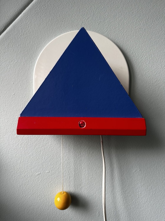 Illumina il tuo spazio con un tocco anni '80 con questa lampada da parete postmoderna Stoja di Ikea, che incarna l'iconico stile Memphis. Questo pezzo è una vivace miscela di colori primari, con un sorprendente paralume triangolare blu completato da audaci accenti rossi e gialli, su una base bianca pulita.