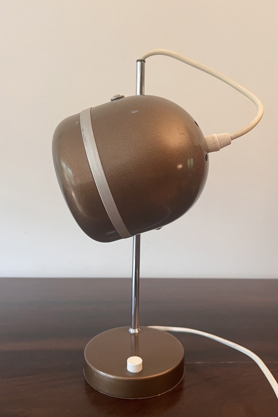 Questa lampada da scrivania Eyeball, ispirata allo spazio, ha un design sorprendente con una testa sferica e un elegante supporto in metallo. La lampada è principalmente marrone con dettagli argentati, che le conferiscono un aspetto retrò-futuristico. È perfetta per aggiungere un tocco di fascino vintage a qualsiasi spazio di lavoro. È in buone condizioni, presenta solo lievi graffi e funziona perfettamente, fornendo una luce concentrata ideale per leggere o lavorare.