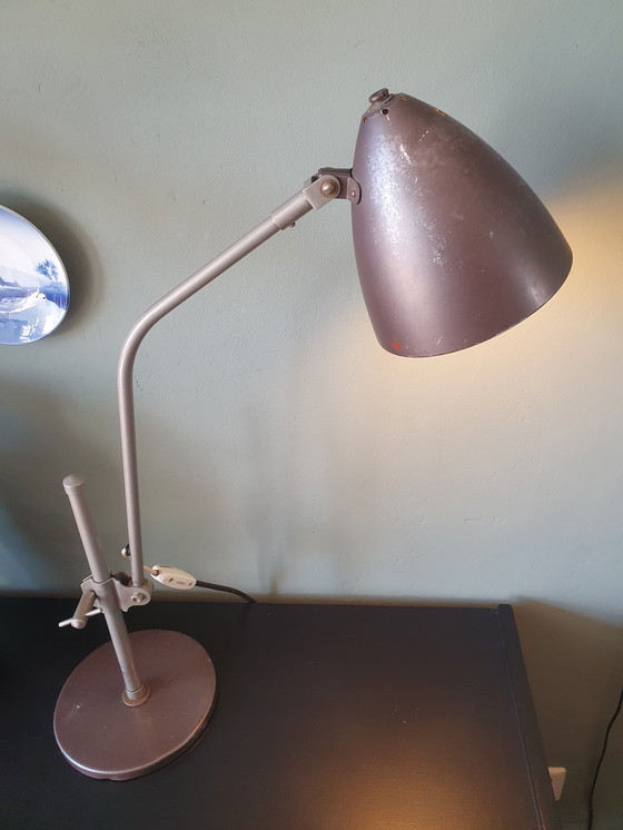Lampada da scrivania vintage regolabile Hala, disegnata da H. Busquet (1914-1977) per Hala negli anni '40. Questa lampada da scrivania Hala è realizzata in ferro ed è completamente regolabile. Il braccio può essere inclinato e ruotato. L'altezza è regolabile da 54 a 77 cm. Anche il paralume è regolabile (diametro del paralume 15 cm). Questa lampada da scrivania vintage ha un aspetto molto industriale, e sia il paralume che la base sono invecchiati in questo stile. Vedi foto per le condizioni. Questo modello è piuttosto raro e raramente reperibile. Marchio: Hala. Dal 1909, Hala è sinonimo di illuminazione di alta qualità. Il designer industriale H.Th.J.A. Busquet ha lavorato presso Hala dal 1932 al 1955. Nel 1955, H. Busquet progettò una lampada per la serie solare Hala (oggi un classico del design).