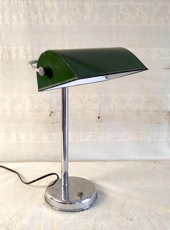 So Deco! Lampada snodabile in stile Art Déco. È composta da una base in metallo cromato con interruttore e paralume in smalto verde all'esterno e bianco all'interno. Autentica lampada vintage originariamente utilizzata negli uffici SNCF (Ferrovie Nazionali Francesi). Buone condizioni: solida, pulita e stabile. Presa B22, interruttore, cavo e spina sono originali. Altezza: 40 cm Larghezza: 27 cm Profondità: 20 cm Peso: +/- 2 kg