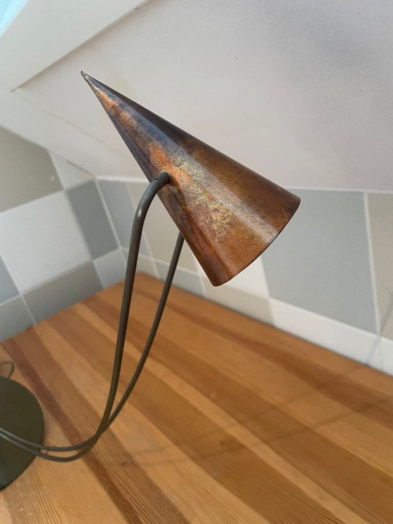 Lampada da scrivania "Swaen" del designer/artista Pieter Spruyt. Materiale: rame/ottone. Alogena, dimmerabile. Dimensioni: lunghezza 65 cm, altezza 45 cm. Prezzo: €550. "Prezzo nuovo" (non più in produzione, quindi un oggetto da collezione): €850. Condizioni: mai usata; come nuova.