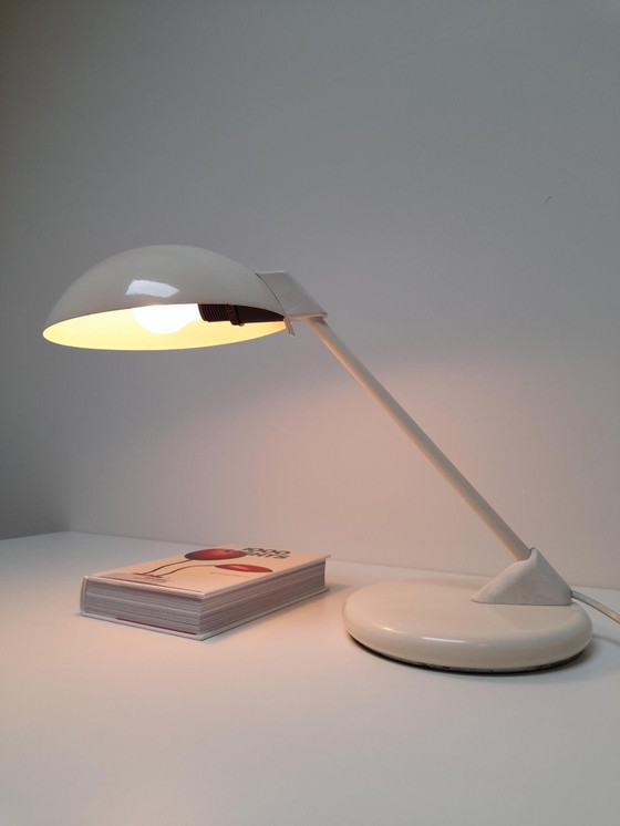 Linee pulite, design funzionale e un tocco di fascino anni '50. Questa lampada da scrivania vintage in metallo bianco è un elemento di stile su qualsiasi scrivania o tavolino. Caratterizzata da una base rotonda in metallo bianco e un paralume in metallo perforato, ha un aspetto leggero e grafico, senza tempo. Il design regolabile la rende non solo bella, ma anche pratica. Prodotta in Svezia negli anni '60 da SENECA Lighting. Un raffinato esempio di artigianato scandinavo. In buone condizioni vintage e pronta per illuminare i vostri spazi.