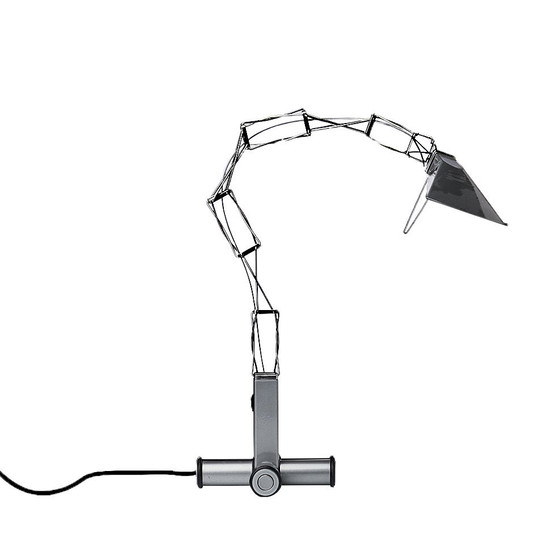 Lampada Multi X disegnata da Yaakov Kaufman prodotta da Lumina - Italia - 1980 Magnifica e rara lampada da scrivania postmoderna che unisce funzionalità e futurismo. È composta da una rete di sottili aste in acciaio inossidabile filigranate, collegate tra loro, che mantengono il loro equilibrio grazie al loro orientamento opposto. Il braccio della Multi X Light può essere ruotato e piegato in tutte le direzioni, con grande flessibilità. Il diffusore, semplice ma efficace, ha una maniglia per la regolazione libera. La lampada è regolabile su due livelli di intensità. In ottime condizioni, pari al nuovo, perfettamente funzionante. • Descrizione: Lampada da tavolo, scrivania o ambiente • Designer: Yaakov Kaufman • Produttore: Lumina • Origine: Italia • Materiale: Acciaio • Produzione: 1980 • Condizioni: Eccellenti, usata pochissimo. • Lampadina: Alogena G9, compatibile con LED • Dimensioni: Braccio 75 cm - Diffusore: 15 cm - Base 16 cm x 16 cm