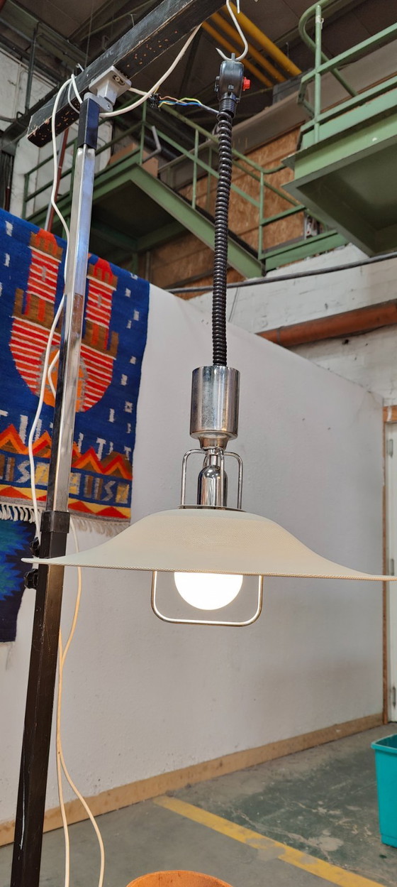 Splendida plafoniera regolabile in altezza dell'azienda tedesca Cosack, risalente alla fine degli anni '70, in buone condizioni d'uso. La lampada è ideale per illuminare sopra un tavolo da pranzo o superfici di lavoro. La regolazione dell'altezza funziona ancora perfettamente e le condizioni generali sono buone, con solo lievi segni di usura e del tempo. Il paralume perforato proietta un'interessante luce verso l'alto.