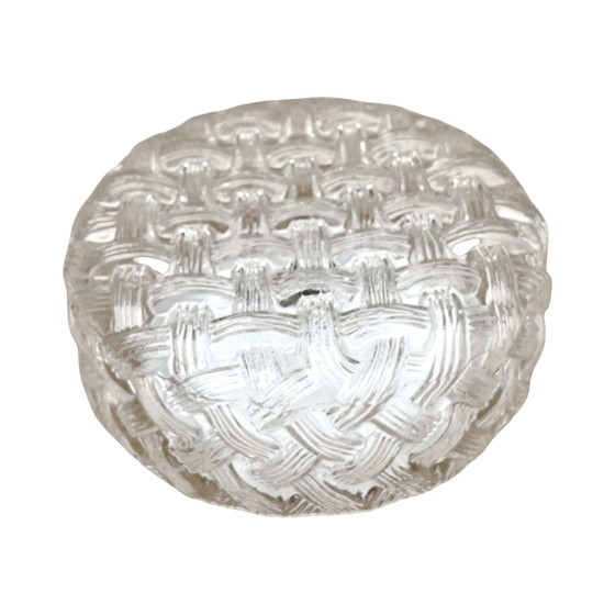 Lampada da soffitto o da parete di grandi dimensioni, a sezione circolare, prodotta da Eickmeier Leuchten in Germania negli anni Settanta. Una lampada con paralume in vetro trasparente con un'interessante struttura spaziale ispirata al materiale intrecciato, posta su una base in metallo bianco. Una classica lampada da soffitto della seconda metà del XX secolo, conservata in ottime condizioni, con minimi segni d'uso. La lampada è predisposta per una singola lampadina E27.