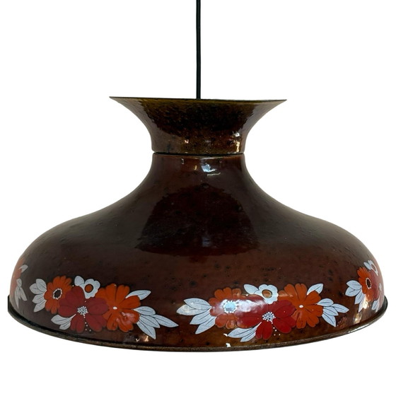 Lampada da soffitto/sospensione in metallo vintage - Decorazione floreale su smalto marrone - (Attr. To) Kaj Franck Fog & Mo