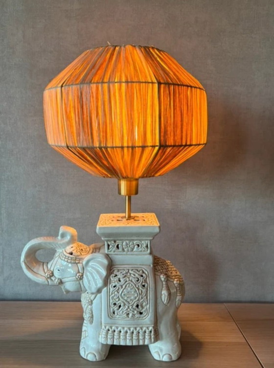 Lampada da tavolo a forma di elefante con paralume beige plissettato. Un bellissimo elemento decorativo che crea anche una piacevole luce d'atmosfera. Funziona bene ed è molto elegante.