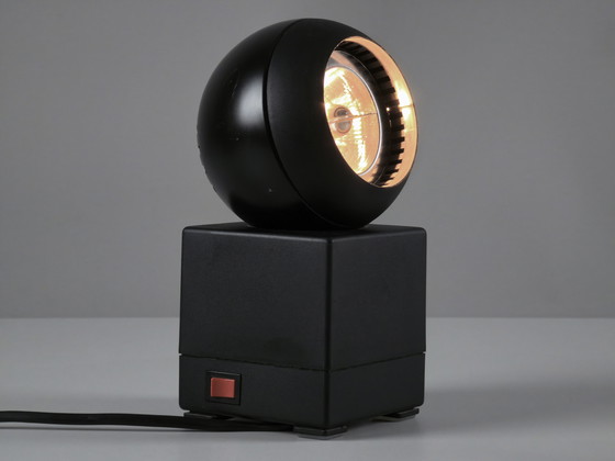 Lampada da tavolo alogena vintage Modernista modello 43602 di Schlagheck & Schultes Design per Osram. La lampada presenta una testa sferica in metallo nero opaco che poggia su una base cubica a plinto, che ospita anche il trasformatore.