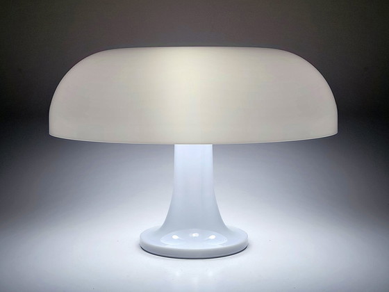 Ecco un esemplare bianco e uno arancione! Provenienti da un vecchio magazzino, due serene lampade a fungo dal design retrò vintage. Il design minimalista e la naturale eleganza dello stelo sottile e del paralume a forma di fungo creano un look senza tempo. Questa è una riproduzione economica della classica lampada Nessino di Artemide. Le lampade sono realizzate interamente in plastica bianca e arancione. L'interruttore offre due varianti di luce: luce bianca e luce calda. Viene fornita con 4 lampadine LED E14 adatte per il risparmio energetico e una maggiore durata. Questo era un modello da esposizione ed è in ottime condizioni; l'altra è nella scatola. Dimensioni: L 32 x P 32 x A 23 cm. Peso: 1150 grammi. Queste sono le mie foto originali e fanno parte della descrizione. I costi di spedizione indicati si applicano solo ai Paesi Bassi e al Belgio. Possono essere visionati e ritirati presso 3930 Hamont-Achel, Belgio.