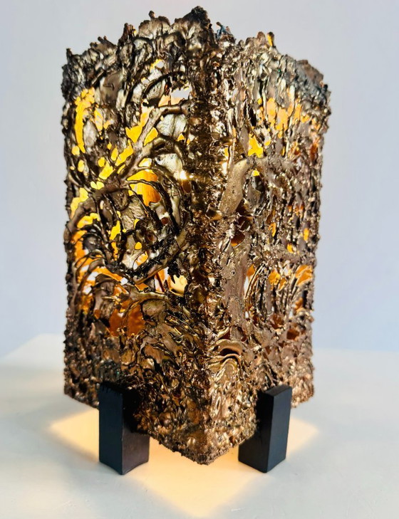 Questa lampada da tavolo brutalista, progettata dallo scultore finlandese Aimo Tukiainen per Oy Moonlight negli anni '70, è una potente espressione di materialità e forma. Presenta un sorprendente paralume rettangolare in rame lavorato a mano, caratterizzato da una superficie strutturata e scultorea che conferisce alla lampada il suo caratteristico carattere brutalista. Le calde tonalità del rame interagiscono magnificamente con la luce, creando un'atmosfera suggestiva ma accogliente.