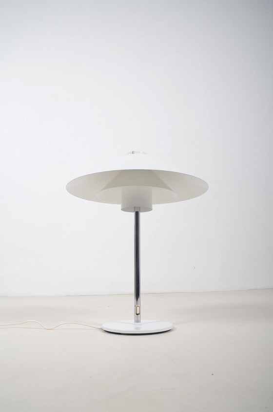 Lampada da tavolo danese chiamata "Trapez", progettata negli anni '70 da Christian Hvidt per Nordisk Solar Company. La lampada è dotata di tre paralumi graduati fissati a un alloggiamento cilindrico, che creano una luce molto piacevole. Il materiale utilizzato è alluminio laccato bianco. L'alloggiamento della lampada è rosso. Il paralume poggia su una base robusta, con l'interruttore perfettamente integrato nell'asta di rame.