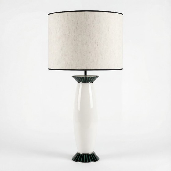 Prodotta dall'azienda italiana VeArt negli anni '80, questa lampada da tavolo presenta una silhouette verticale pulita realizzata in vetro di Murano. Il design è definito da un corpo in opalino bianco in contrasto con discreti collari in vetro rigato alla base e al collo, dettagli che conferiscono struttura senza alterare la semplicità della forma. VeArt, fondata nel 1965 da Ludovico Diaz de Santillana, ex direttore artistico di Venini, è nata per fondere la tradizionale lavorazione del vetro con i moderni standard produttivi, concentrandosi sull'integrità geometrica. La qualità del vetro garantisce una distribuzione uniforme e morbida della luce, rendendola un pezzo versatile e funzionale sia per spazi residenziali che per studi professionali.