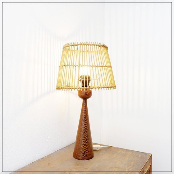 Lampada da tavolo in legno a forma di birillo con paralume in bambù, anni '60