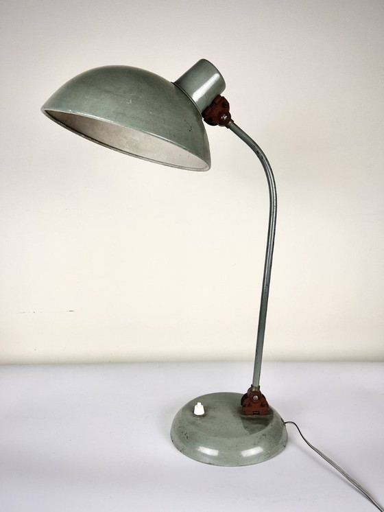 Lampada da tavolo industriale vintage in metallo verde patinato. Testa inclinabile, paralume grande (22 cm), lampadina con base B22. Altezza massima 53 cm. Visibili segni di usura.