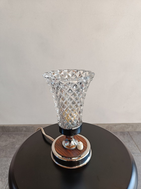 lampada vintage, lampada da tavolo, lampada anni '70, design italiano, moderno di metà secolo, lampada space age, lampada in vetro, vetro pressato, vetro testurizzato, lampada cromata, base in legno, illuminazione retrò, lampada da comodino, luce ambientale, illuminazione decorativa, vetro geometrico