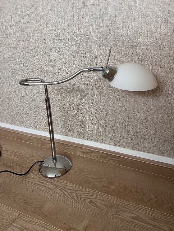 Lampada da tavolo in stile Mid-Century, cromata color argento, con paralume in vetro satinato bianco. Il paralume è in vetro satinato, bianco opaco o opalescente, che diffonde la luce in modo morbido e uniforme. Prodotta in Italia. La lampada è regolabile tramite un perno.