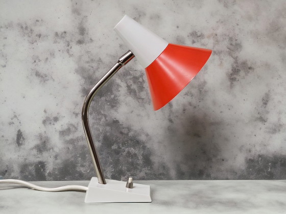 Questa lampada da tavolo degli anni '60 ha un design molto semplice e chiaro con un paralume color rosso-arancio in metallo laccato e un collo della lampada cromato e può essere inclinata verso l'alto e verso il basso grazie a un giunto. La base bianca della lampada, come il supporto del paralume, è in plastica bianca.