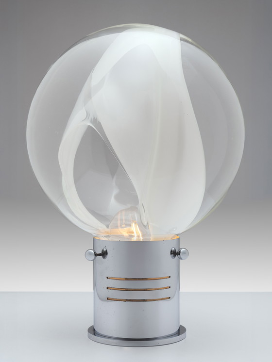 Il paralume a ciotola ha accumulato un paio di piccoli graffi all'interno degli strati di vetro nel corso degli anni. La base è in metallo cromato e mostra una leggera patina, coerente con l'età e l'uso.