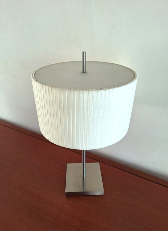 Materiale: Cromo/RS e paralume in tessuto plissettato in bianco sporco.