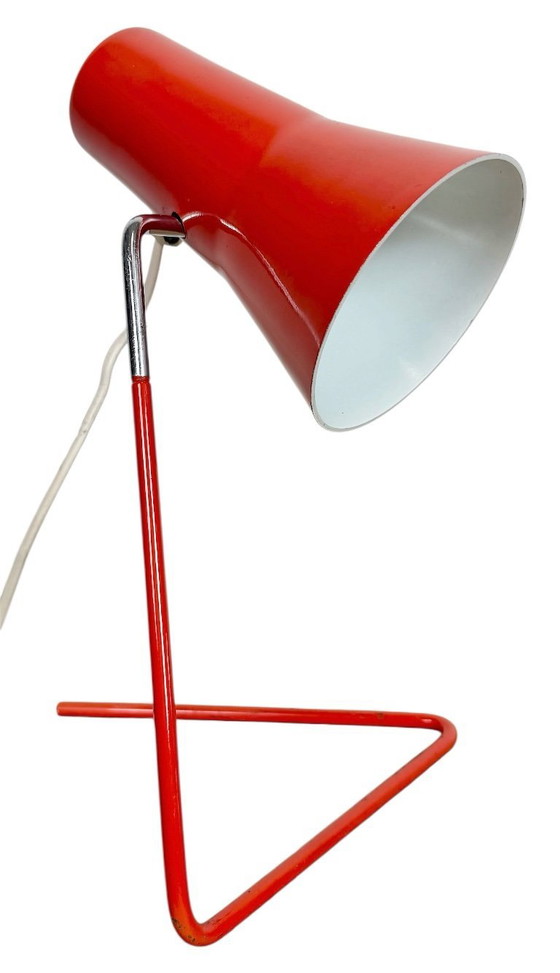 Questa lampada da tavolo rossa modello 21616 è stata prodotta da Drupol e progettata da Josef Hurka nell'ex Cecoslovacchia negli anni '60. Presenta un paralume in metallo e una gamba in ferro. Il portalampada richiede lampadine standard E14. Buone condizioni vintage.