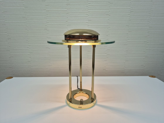 Lampada da tavolo Saturn di Robert Sonneman per l'azienda olandese SMC Boxford. Lampada da scrivania "Bankers"/lampada Saturn/lampada UFO degli anni '80 con dimmer e vetro temperato. Con lampadina alogena e spina europea. Il dimmer funziona. In buone condizioni vintage con lievi segni di usura dovuti al tempo.