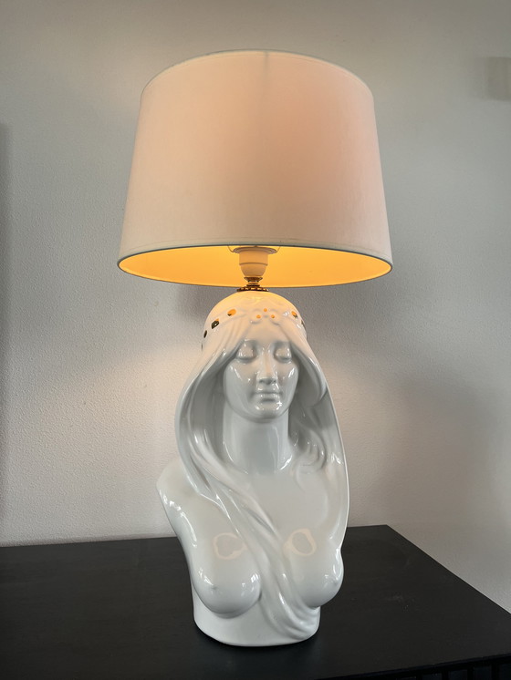 Lampada da tavolo vintage Hollywood Regency a forma di busto di donna. Una lampada straordinariamente unica, probabilmente realizzata in Italia negli anni '70 per il mercato spagnolo. Questa splendida lampada in ceramica bianca presenta sorprendenti accenti dorati sulla testa della splendida donna. Per esaltare l'effetto scenografico, la lampada (💡 foto) utilizza una lampadina a LED che emette una luce dorata, ma questa lampada è già di per sé un pezzo forte, quindi non è adatta a interni modesti. L'altezza totale è di 64 cm e la larghezza è di circa 36 cm; la donna misura 40 cm x 25 cm.