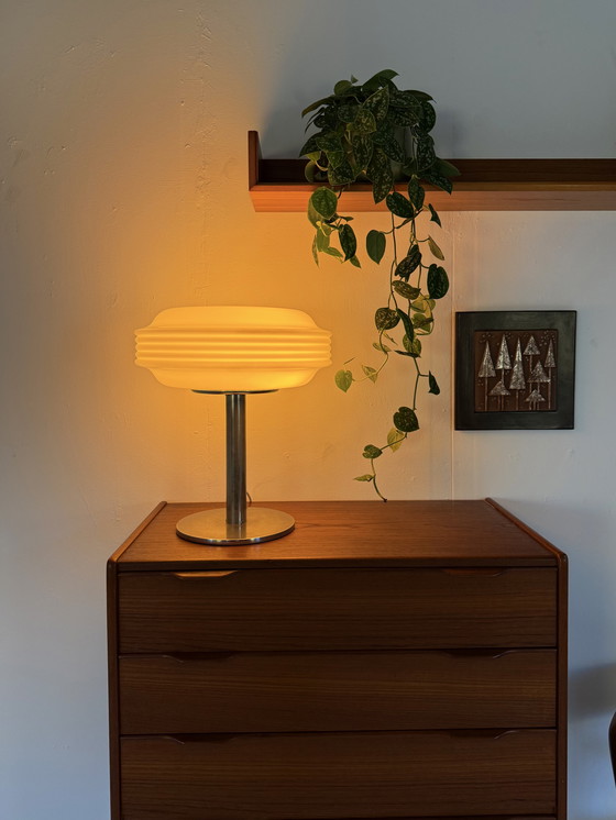 Splendida e unica lampada da tavolo. Base cromata nera con una splendida finitura arrotondata. Stelo spesso con uno splendido paralume in vetro opalino spesso e di alta qualità. Design elegante con graziose finiture arrotondate.