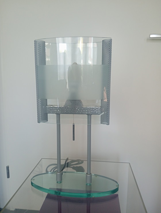 Lampada da tavolo elegante e unica, dal look modernista. La lampada ha un paralume in vetro smerigliato e trasparente, abbinato a metallo perforato sui lati. La base è in vetro laminato con supporti in metallo, che creano un carattere minimalista e industriale. Si aziona tramite un elegante interruttore a cavo.