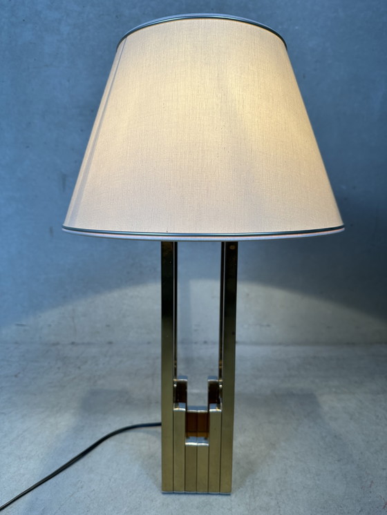 Lampada da tavolo Hollywood Regency. Stile Willy Rizzo e F. Fabbian. Marchio sul paralume: Lumica. Bicolore (oro e argento). Ottima qualità. Un attacco E27. Interruttore in bachelite. Altezza: 60 cm. Diametro: 35 cm. In buone condizioni. Peso: 2,1 kg.