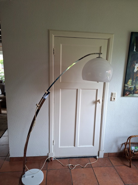 Questa splendida lampada ad arco vintage Space Ace è un vero e proprio colpo d'occhio in qualsiasi ambiente. Con la sua elegante forma ad arco e le linee pulite, aggiunge un tocco di retrofuturismo al tuo spazio abitativo. Il paralume in plastica proietta una luce morbida e invitante, ideale per creare un'atmosfera calda nel tuo soggiorno o studio. La robusta struttura in metallo offre non solo stabilità, ma anche un look moderno che si adatta perfettamente a diversi stili d'interni.