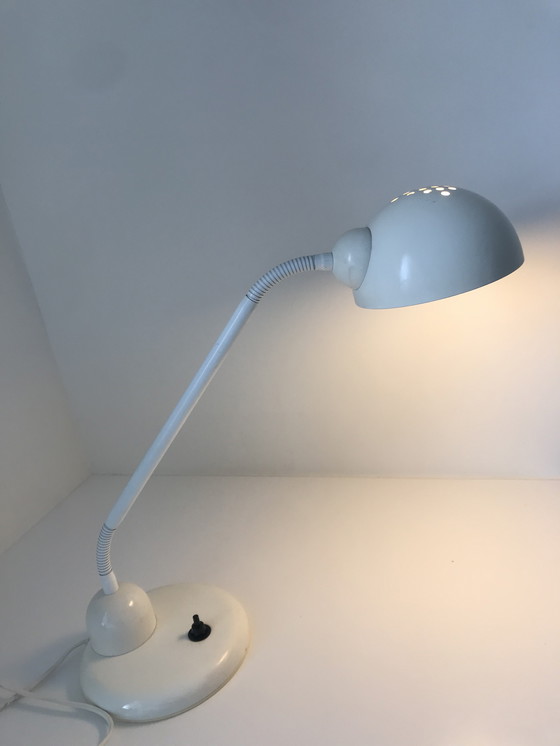 Lampada da tavolo vintage Vrieland bianca. La lampada ha 2 pezzi flessibili nel collo, che consentono di regolare la lampada in diverse posizioni e altezze. Pulsante nero di accensione/spegnimento sulla base. La lampada è in condizioni vintage e funzionante. Altezza 50 cm diametro paralume 12 cm diametro base 17 cm